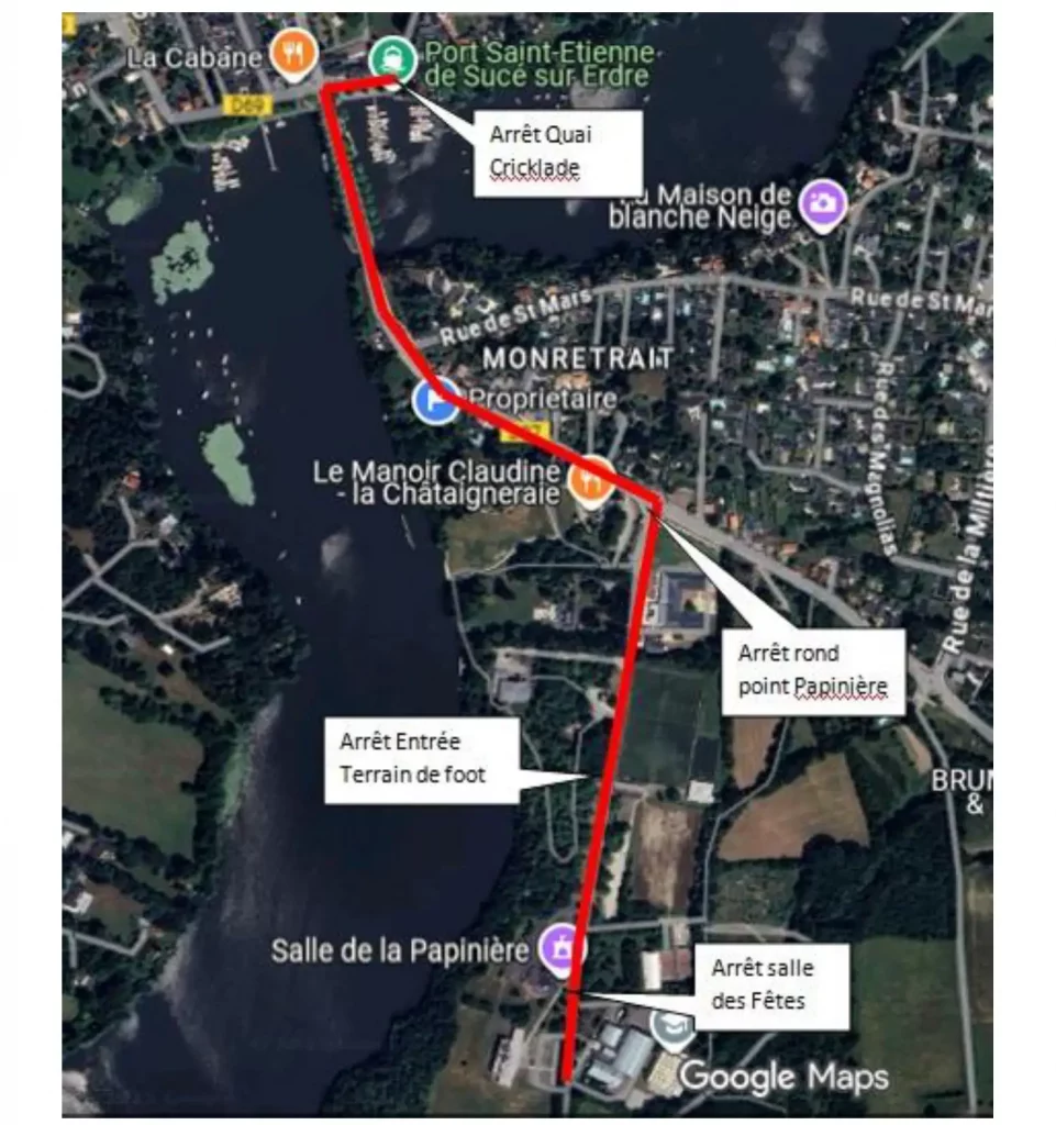 Circuit 2 Départ/Arrivée : Salle des Fêtes de la Papinière ↔ Quai Criklade Arrêts intermédiaires : Entrée du terrain de football & Rond-point de la Papinière