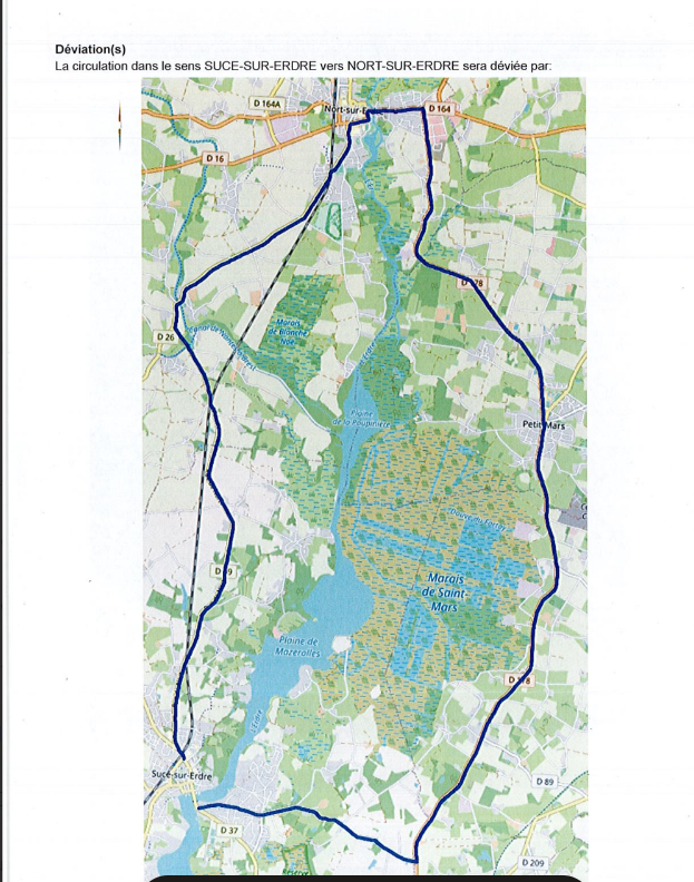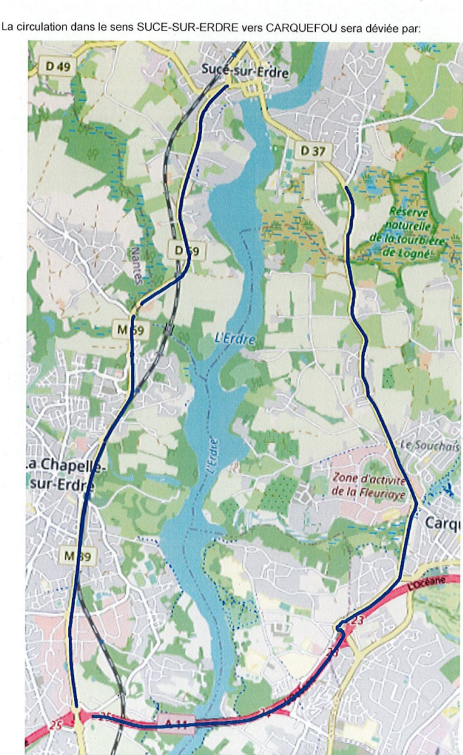 Deux déviations sont proposées aux usagers pour traverser l’Erdre : par Nort-sur-Erdre et par la Chapelle-sur-Erdre.